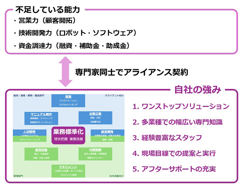 当社は、営業力(顧客開拓)、技術開発力(ロボット・ソフトウェア)、資金調達力(融資・補助金・助成金)といった分野で不足している能力を補うため、専門家同士でのアライアンス契約を締結しています。これにより、各分野の専門知識や技術を取り入れ、ワンストップでお客様に最適なサービスを提供することが可能です。